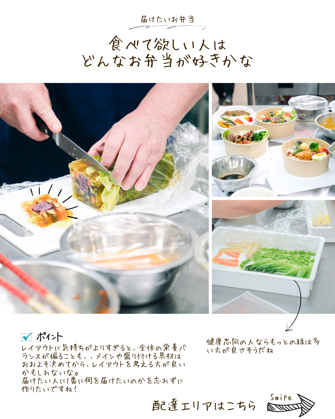 レイアウトに気持ちがよりすぎると、全体の栄養バランスが偏ることも、、メインや盛り付ける具材はおおよそ決めてから、レイアウトを考える方が良いかもしれないな。届けたい人に1番に何を届けたいのかを忘れずに作りたいですね!